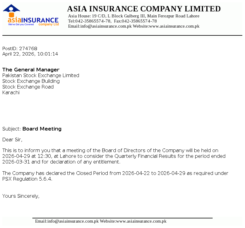 Asia Insurance Company Limited is a quoted public limited company which was incorporated in Pakistan on December 06, 1979 under the repealed Companies Act, 1913 (now the Companies Act, 2017). The Company is engaged in non-life insurance business mainly comprising of fire, marine, motor, bond and suretyship, agriculture and allied and miscellaneous.